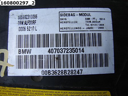 Подушка безопасности в дверь Артикул: 160800297 Оригинальный номер: 407037235014 Производитель: BMW Описание: задняя левая 407037235014 Применимость: BMW X5 E53 1999-2006